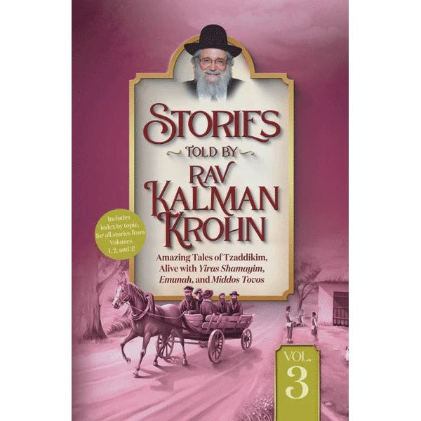 Includes Index by topic for all stories from Volumes 1, 2, and 3! Amazing Tales of Tzaddikim, Alive with Yiras Shamayim, Emunah, and Middos Tovos On the heels of the widespread popularity of Volumes 1 and 2 of Stories Told by Rav Kalman Krohn, we present you with another tantalizing collection of stories told as only Rav Kalman could… When Rav Kalman Krohn told a story, he had everybody spellbound. As his thousands of avid listeners can attest, this tremendous tzaddik and talmid chacham had the rare ability to weave true stories of yesteryear that kept adults and kids alike at the edge of their seats in suspense, while simultaneously inspiring their hearts and firing their souls. Rav Kalman’s stories weren’t just ma’asalech. His sippurei tzaddikim, like his own essence, were saturated with yiras Shamayim, middos tovos, and Torah lessons. Many of the stories Rav Kalman related are not well-known, yet they are all sourced in mesorah and the sefarim hakedoshim. And they are all action-packed, full of heart-stopping twists and turns that may well cause readers to get the goosebumps! In Stories Told by Rav Kalman Krohn: Volume 3, we offer another sampling of the best of Rav Kalman’s stories, for readers of all ages to learn from and enjoy. Sink yourself into these amazing, true tales, and let their power—and that of Rav Kalman’s own neshamah—capture and enrapture you. Pages: 430 - Dimensions: 9" x 6"